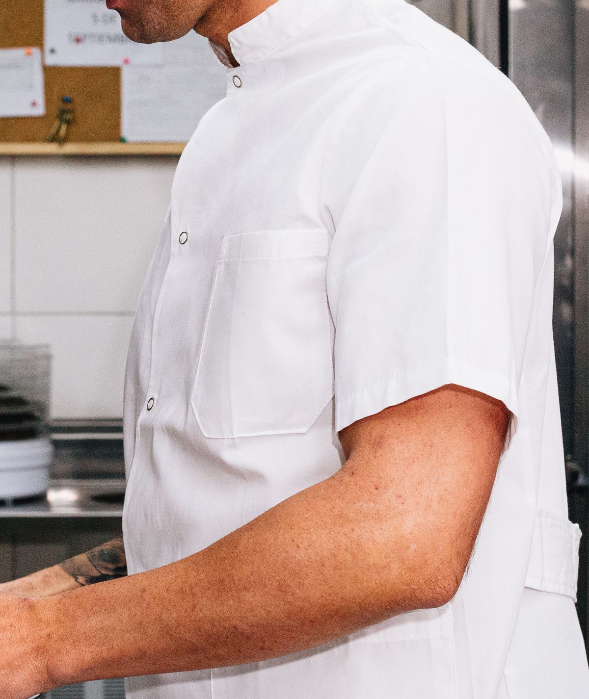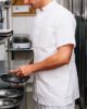 Chaqueta manga corta cuello mao masculina. Martingala en espalda. Dos bolsillos inferiores plaqué y uno superior. Cierre con broche a presión.