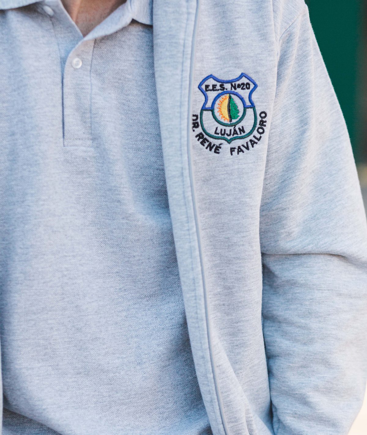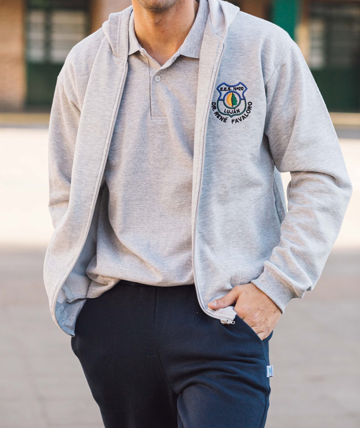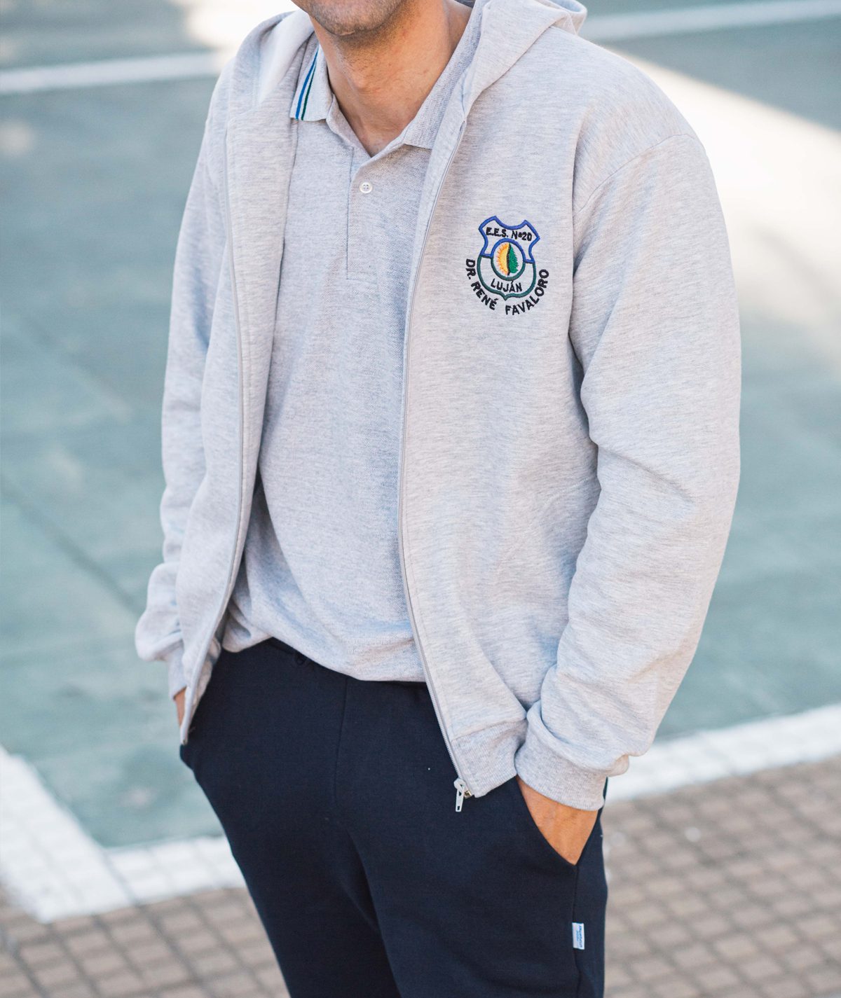 Campera de frisa con capucha. Cintura y puños de rib. Bordado en frente izquierdo EES Nº20